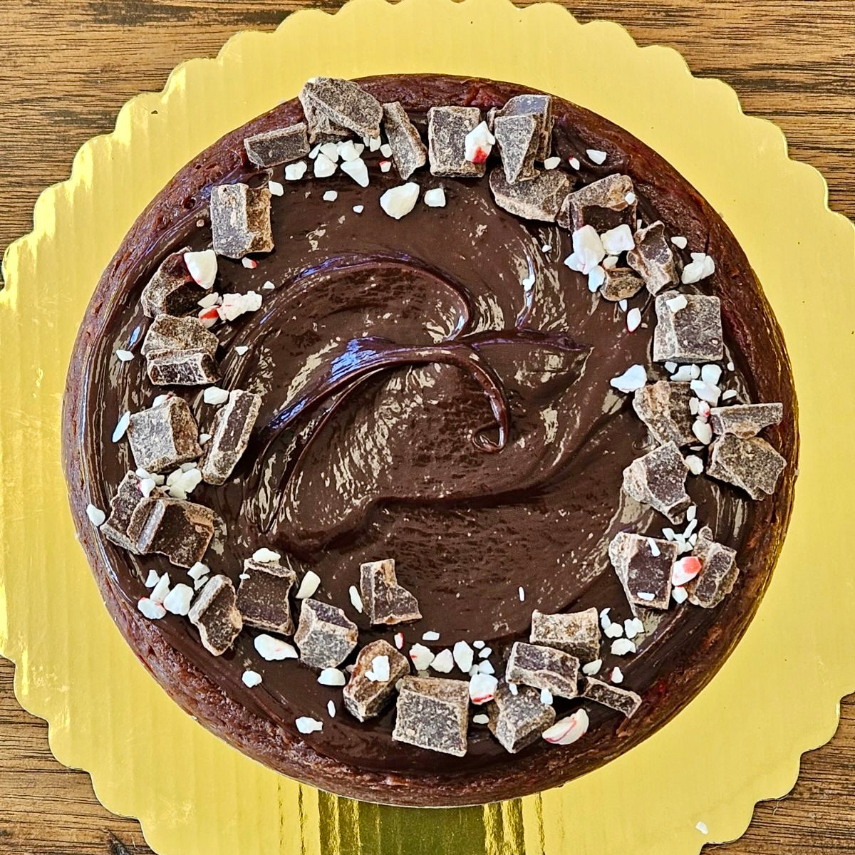 Oreo crumb crust, chocolate cheesecake, chocolate ganache, peppermint candy garnish