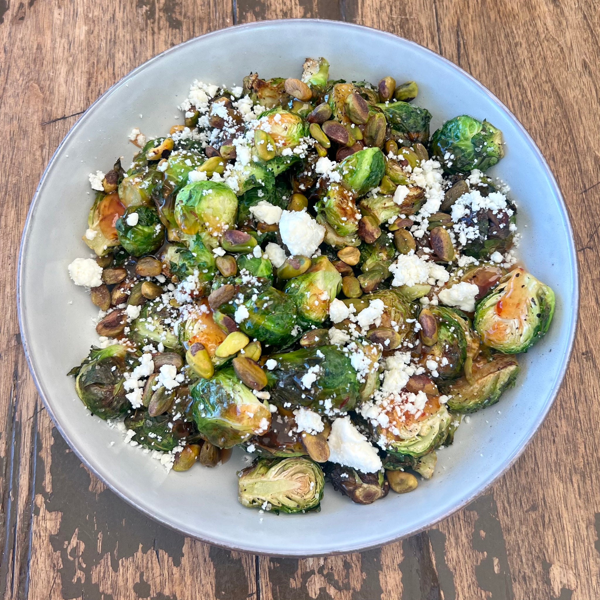 Roasted brussels sprouts, pistachios, dried cranberries & balsamic glaze, salt & pepper