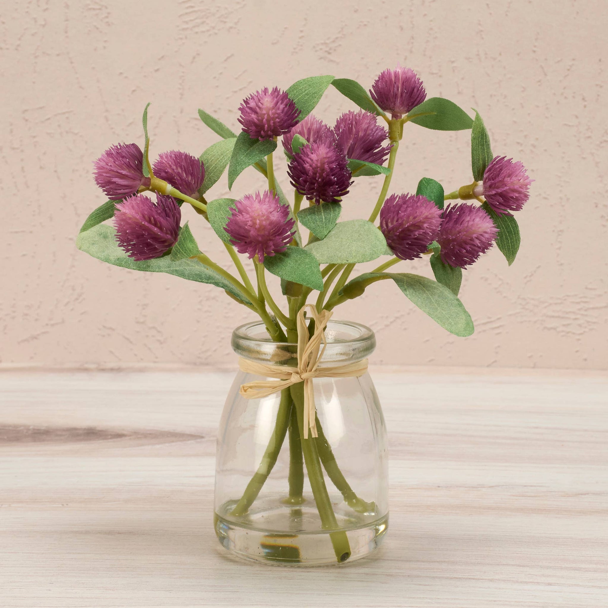A small glass vase from our Botanical Collection featuring a delightful globe amaranth bouquet. Faux plants bring botanical vibes to any space with zero maintenance. Vase bottom contains a silicone fill to resemble water. Our Globe Amaranth vase complements well with coordinating pieces in collection for a charming display. Complete as shown. A floral-themed home accent perfect for easily adding natural style where real plants cannot thrive.